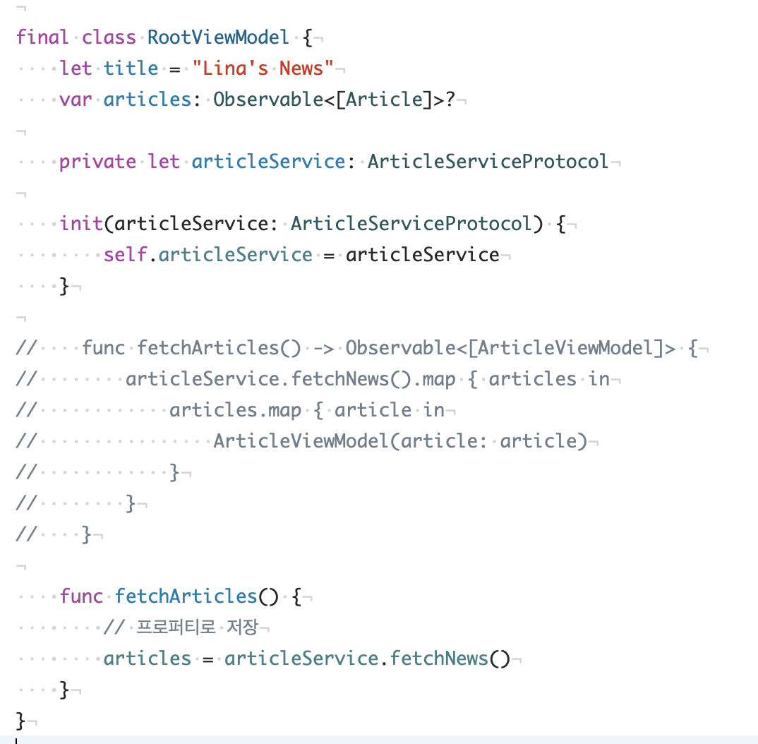 RootViewController -> RootViewModel -> ArticleService 요렇게 바라보는 방식이고,