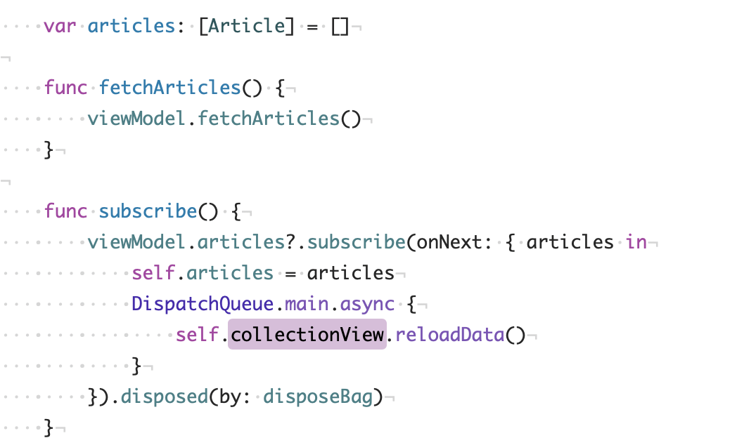 3. subscribe에서는 viewModel의 articles를 직접 구독하여 뷰의 articles에 저장하고, collectionView reload를 한다.