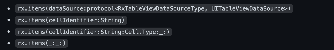 1) rx.items(dataSource:protocol<RxTableViewDataSourceType, UITableViewDataSource>)