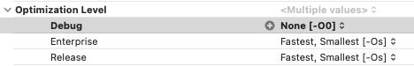 → 이부분 너무 이해가 안돼서 20번도 넘게 읽은거같다.. ㅎ 근데도 아직 잘 모르겠다. 여기서 말하는 최적화라는건, 컴파일 속도에 대한 최적화인 것 같다.(Swift Optimization 구글에 검색했더니 '컴파일러'의 Optimization에 관한 내용, 방법들만 나오니 그런것으로 간주하는중) Project의 Build Setting에 보면 최적화 레벨을 설정할 수 있는데 이에 따라 컴파일 속도가 달라진다.(아래 캡쳐에 있음) 이 최적화 레벨에 따라 call by reference가 될 수도 안될수도 있기 때문에(아마도 최적화 레벨을 올리면 inout키워드로 쓰인 파라미터가 copy-in copy-out이 아닌, call by reference로 진행된다는 것 같음), 이 최적화 레벨과 상관없이 잘 동작하도록 in-out 키워드를 잘 쓰라는 말인 것 같다.