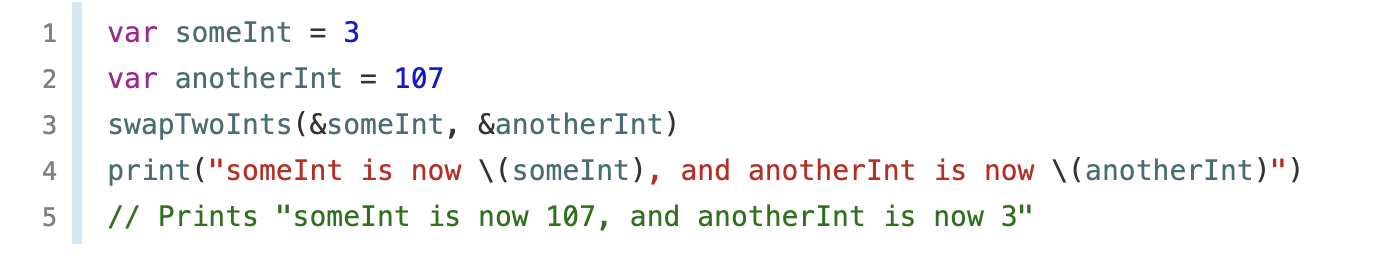 아래 예제에서, swapTwoInts(::)를 통해 someInt와 anoterInt의 값이 바뀐걸 알 수 있다.