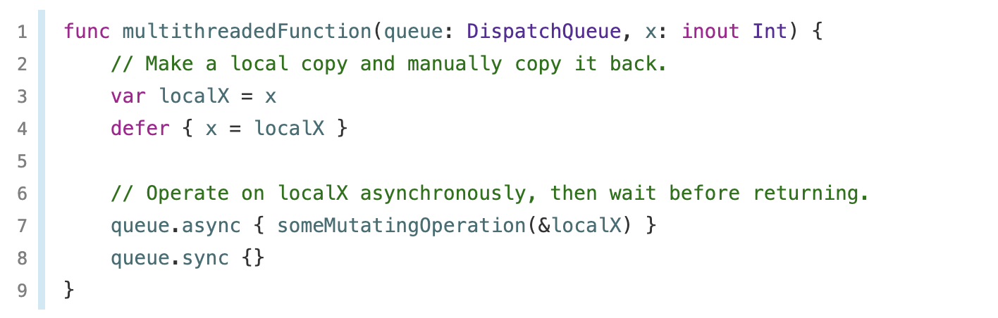 → 위 코드는 명시적인 local 복사본을 만들고, defer을 통해서 원래 변수에 넣어주고 있다.