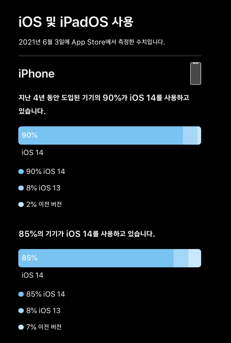 Apple Store 지원에 따르면, 지금 iPhone 기기의 약 93%가 iOS 13 이상의 버전을 사용하고 있다고 한다.