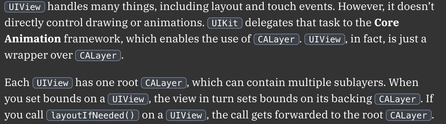 UIView는 사실 CALayer의 wrapper일 뿐이다. UIView는 많은 것을 처리하지만 사실 어떤 그림이나 애니메이션들은 직접 제어하지 않고, 내가 view에 어떤 일을 시키면 이 안의 layer객체에서 이 일을 직접 수행한다.